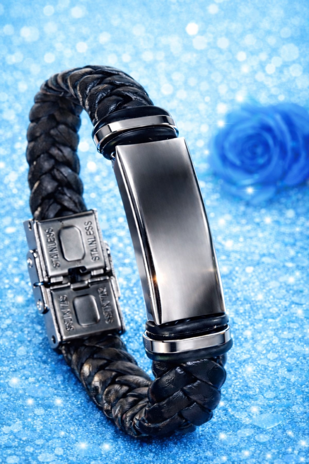 • Svart läderflätat arrmband med knäppe & detaljer i rostfritt stål – stilrent, tidlöst och maskulint